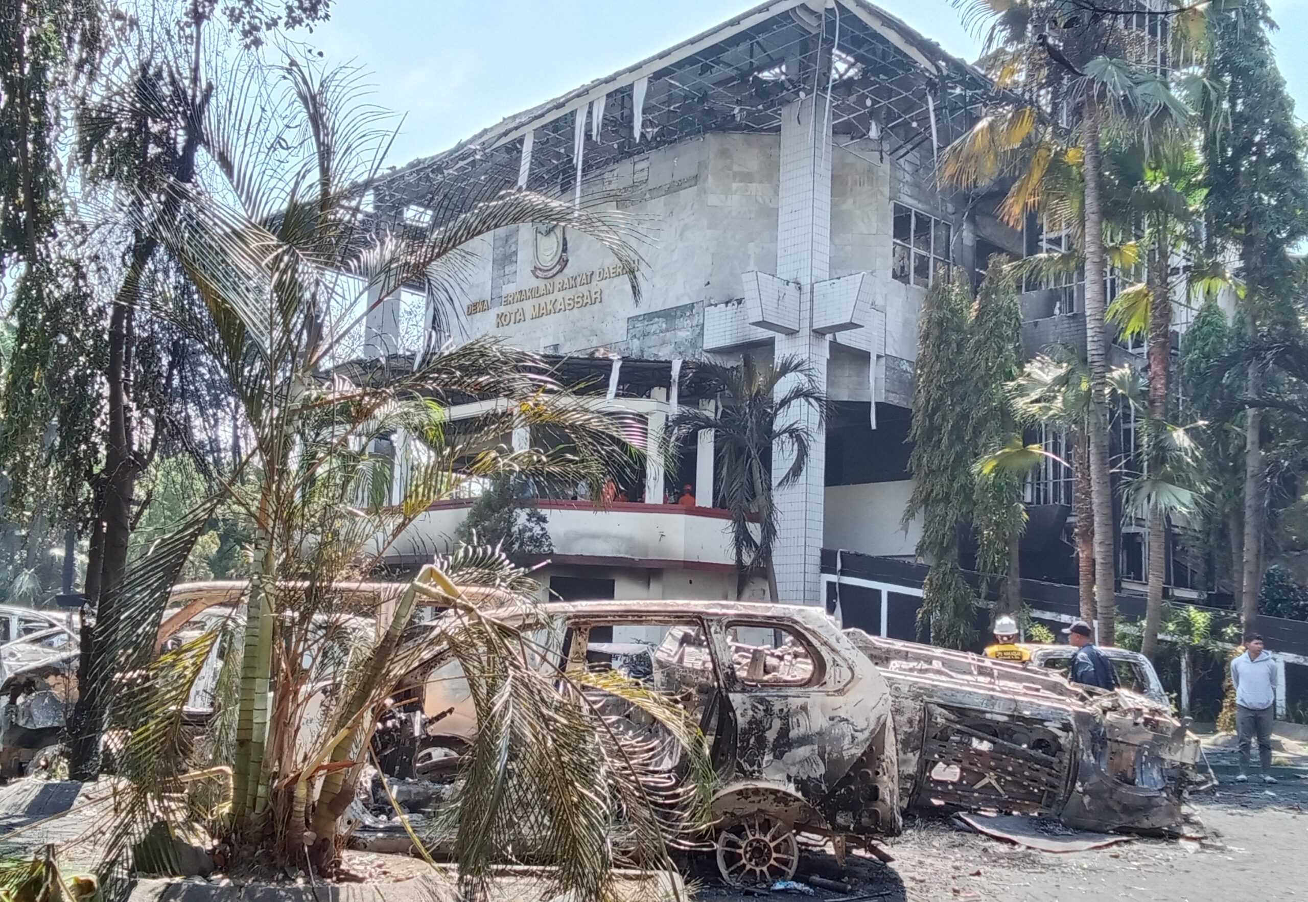 Kondisi terkini Kantor DPRD Makassar, Jl AP Pettarani, Sabtu (30/8/2025) pasca dibakat massa aksi demo pada Jumat malam (29/8/2025). (foto: Abatanews)
