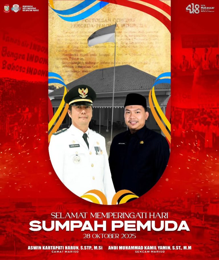 ABATANEWS, MAKASSAR – Camat Mariso Aswin Kartapati Harun, S.STP., M.Si bersama Sekretaris Camat (Sekcam) Mariso Andi Muhammad Kamil Yamin, S.ST., MM menyampaikan ucapan Selamat Memperingati Hari Sumpah Pemuda Tahun 2025, Selasa (28/10/2025).
