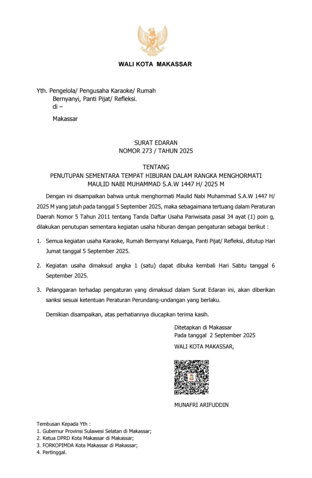 Surat edaran tersebit tertuang melalui SE Wali ota Makassar Nomor 273 Tahun 2025 yang ditandatangani Munafri Arifuddin pada 2 September 2025 lalu.